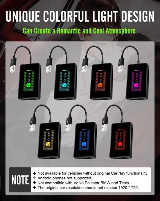Equipped with a smart IC chip and processor, the CarPlay Wireless Adapter brings Google Maps, media and messaging apps to the car display, giving you a pleasant driving environment. ^^ Note - Wireless CarPlay adapter is not compatible with Volvo and Polestar vertical screen models, and BMW and Tesla original wireless carplay models. Your car must have a factory wired CarPlay system to use this adapter (compatible with Apple CarPlay only, not for any other system). Wireless connection can reduce the damage to the phone caused by frequent plugging and unplugging of charging cables. ^^ Powerful Function - Classic fashion appearance. Flgocexs Wireless CarPlay Adapter is compact and lightweight, it can be easily hidden or installed where it will not interfere with your sight. No dashboard mounting required, it works even if your phone is in your pocket. Quick automatic connection, online upgrade, it can bring a pleasant use experience. Unique colorful light design, the gradient interval switches one color in 5 seconds, no heat, it can create a romantic and cool atmosphere. ^^ No Risk to Try - We provide 365 days worry-free warranty after-sales service and friendly customer service.