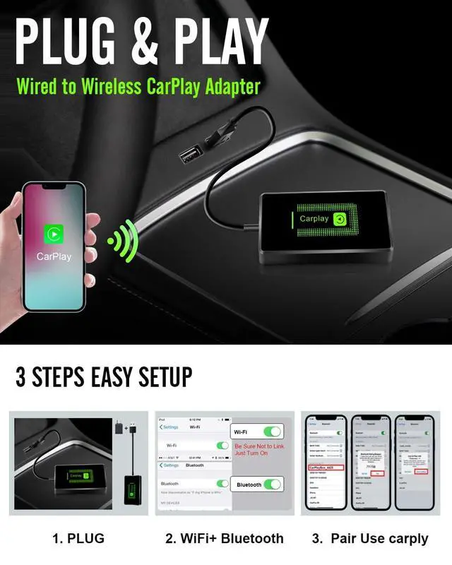 Wireless CarPlay Adapter for Apple - The Wireless CarPlay Adapter can easily convert your wired CarPlay to wireless! Connect via car play wireless adapter, plug and play to enjoy the full CarPlay function and retain the original car operation: navigation, music playing, Siri assistant, phone calls, radio, etc. ^^ Universal Compatibility - Flgocexs wireless CarPlay adapter for iPhone is compatible with more than 800 cars and models, and it is compatible with most cars that support wired CarPlay. We recommend using iOS 10+ or higher for best performance. The original car resolution should not be greater than 1920*720. After the first setup, our wireless CarPlay Adapter will automatically activate the CarPlay wireless connection and quickly connect to your phone every time your ^^ Upgraded Design - Wireless CarPlay dongle for iPhone has an extension cable USB interface, which can effectively avoid the small space and cannot be used, providing a stable and reliable connection. Equipped with a type-c adapter, whether your car interface is USB or USB-C, Flgocexs automatic CarPlay adapter is an ideal choice, providing you with a more relaxed and comfortable driving experience. ^^ Plug and Play - Wireless CarPlay Adapter for factory wired Car-Play features 5 GHz WiFi and Bluetooth 5.0, easy to operate and no delay. No additional apps or drivers required, plug the Type-C end of the cable into the CarPlay Adapter and the other end into your car's CarPlay to enable.