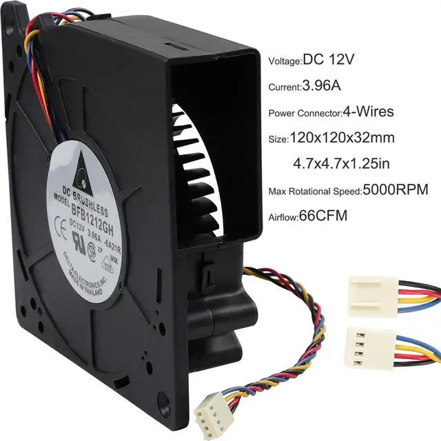 Packaging includes: 1x Cooling Fan. Direct Current: DC 12V / 3.96A; Power Connection: 4-Wires; Size: 120x120x32mm/4.7x4.7x1.25 inch