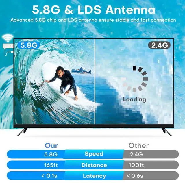 Built-in Antenna: Our wireless HDMI adopts the latest dual-band 5.8GH z/ 2.4GH z WiFi transmission chip, while using a compact appearance while retaining the core technology, the internal antenna to ensure stable and low-latency transmission of video or audio. The internal antenna design brings convenience and powerful transmission together. It has a maximum transmission distance of up to 165ft/50m, but the effective distance may be reduced to 50ft/15m if there are walls or obstacles in the way. White ^^ Zero-configuration Wireless