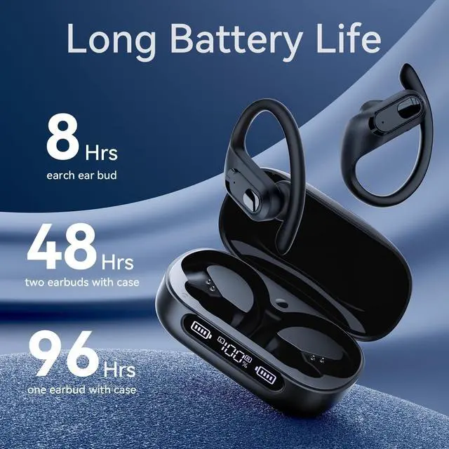 Immersive Music Sound: Our wireless sport earbuds feature ANC noise cancelling technology, which significantly reduces ambient noise interference. High-sensitivity sport headphones with mic ensure crystal-clear calls in any environmentideal for commutes, open offices, or gym workouts. The earbuds with 13mm large size speaker driver delivers powerful bass, mellow midrange, and clear treble, reproducing your music vividly to power your workout ^^ 2. Digital LED Display & 96H Long PlaybackThe LED display charging case accurately shows real-time remaining power of the case and charging progress of each earbud, avoiding sudden power cuts during workout / travel / business trip / weekend hike. T9 ANC bluetooth headphones offer 8hrs of continuous playback per charge, while the charging case can recharge them 5-6 timesproviding up to 48hrs single-ear/96hrs dual-ear playback, perfect for long lasting battery wireless sport earbuds lovers ^^ 3. Ergonomic Anti-Slip DesignThe ergonomic sport earbuds with flexible ear hooks fit snugly, staying put during runs, jumps, or yoga (top anti-slip running headphones). Soft silicone ear tips and a humanized design ensure long-term wear is pain-free and pressurelessno discomfort even after all-day use. The earbuds are sweatproof and rain-resistant, easily handling workout sweat and sudden raindrops, perfect as waterproof earbuds for gym yoga.