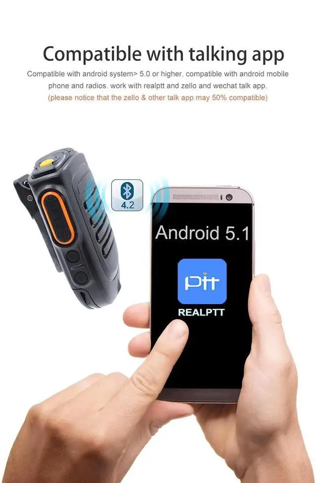 Android phoneNOTE: 1. that this Bluetooth microphone is compatible with android 5.1 F25/G25(not compatible with F22/G22), t-320 and android 6.0, android 7.0 and above, such as 3G-W7, 4G-W7plus zello2. Non-W7/W7+ emergency alarm group switching is not available*SOS function*Big PTT*Group switch*Wireless Microphone work with realptt, zello