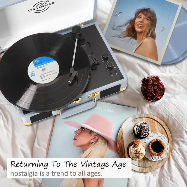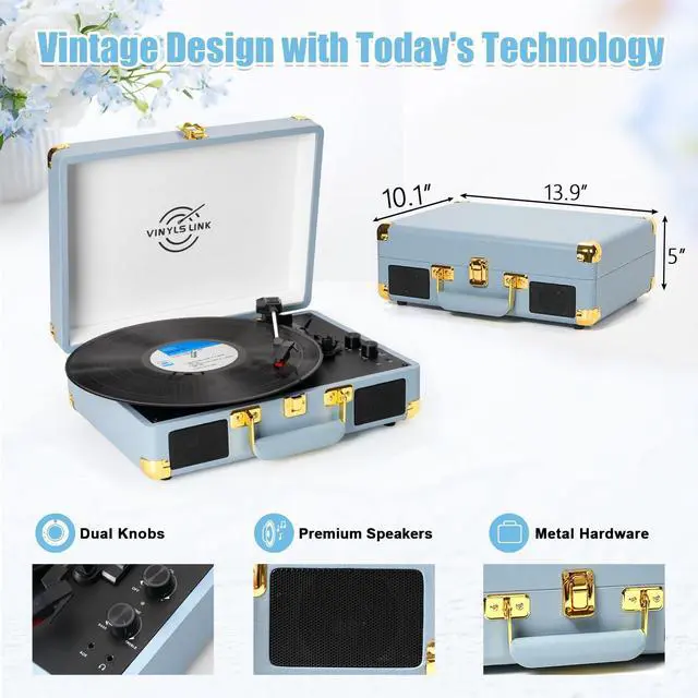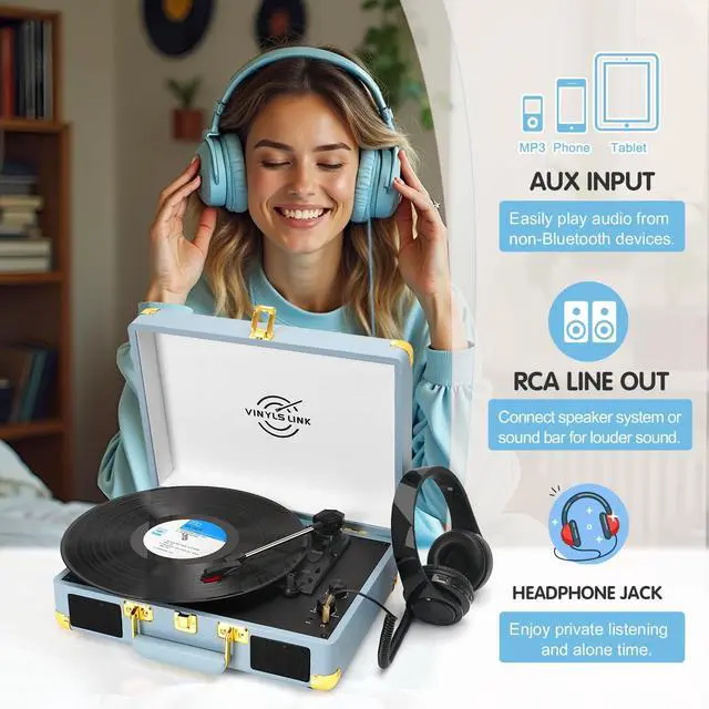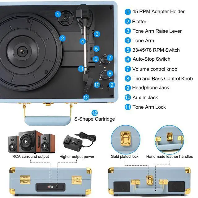 All-in-One Record Player -This record player supports 3 speed: 33-1/3rpm, 45 rpm, 78rpm and 3-sizes of 7", 10" & 12" vinyl records, 45RPM adaptor is secured on the platter; It combines all innovative Bluetooth, bass and treble controls, stereo speakers into one functional suitcase turntable. from retro music ^^ Built in Speakers & Portable Design - Built-in stereo speakers that deliver clear loud sound, enhance the smooth and retro sound of your records, and it is compatible with a DC 5V/1A power supply. This portable vinyl player is ideal for taking on the go to your musical adventures. ^^ Bluetooth & AUX, RCA Connection - The Bluetooth receiver built into the vinyl record player ensures quick connectivity with mobile devices, enabling wireless music playback. It also allows for the connection of external powered speakers, enhancing audio quality via RCA connection. ^^ Belt-Drive Design& Bass Control - Upgraded turtable with a belt-drive base that features spring suspension buffers and four rubber feet. These features help to reduce motor vibration and enhance audio quality. The Bass Adjust knob allows for precise customization of the sound to suit individual preferences. ^^ Easy to Use & Ideal Gift Giving -The vinyl player has a simple desig of dual knobs, making it easy to use for anyone.