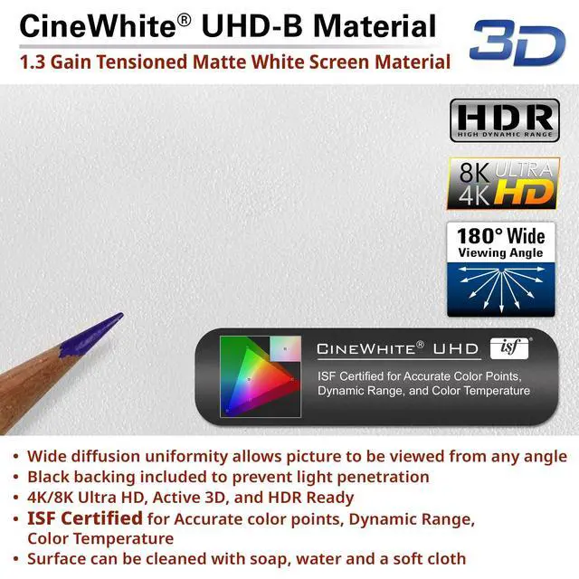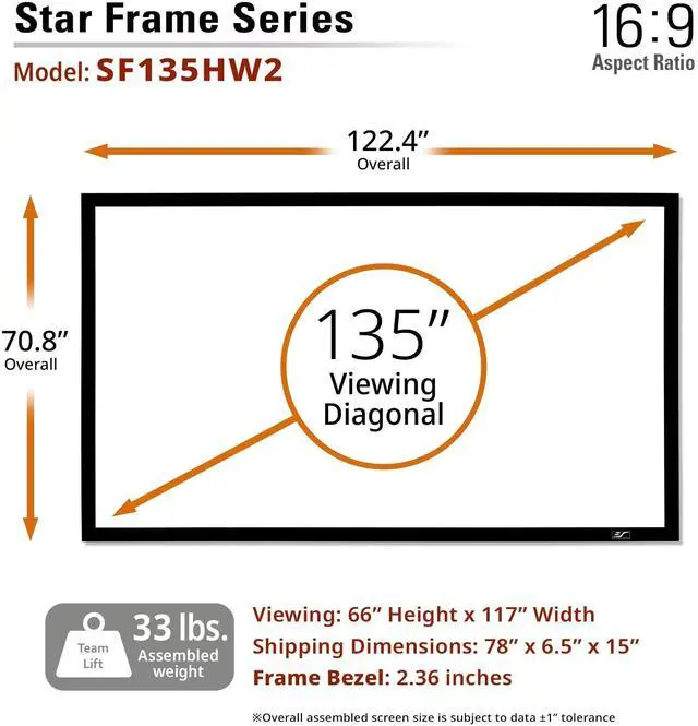 BRING THEATER HOME Upgrade movie nights, gaming, sports, or presentations with the StarFrame 135" fixed-frame projector screen, delivering a professional, cinema-quality experience at home. ^^ STUNNING VISUALS CineWhite UHD-B screen with 1.3 gain and 180 viewing angle ensures vivid color, sharp contrast, and true-to-life clarity from any seat. Optimized for 4K/8K Ultra HD and Active 3D. ^^ ELEGANT & MODERN LOOK 2.75" velvet-wrapped aluminum frame absorbs light overspill to enhance contrast, while adding a sleek, theater-quality finish that elevates your entertainment space. ^^ PROJECTOR COMPATIBILITY 135" diagonal, 16:9 aspect ratio; view size 66" H x 117" W; overall size 70.9" H x 122.4" W.