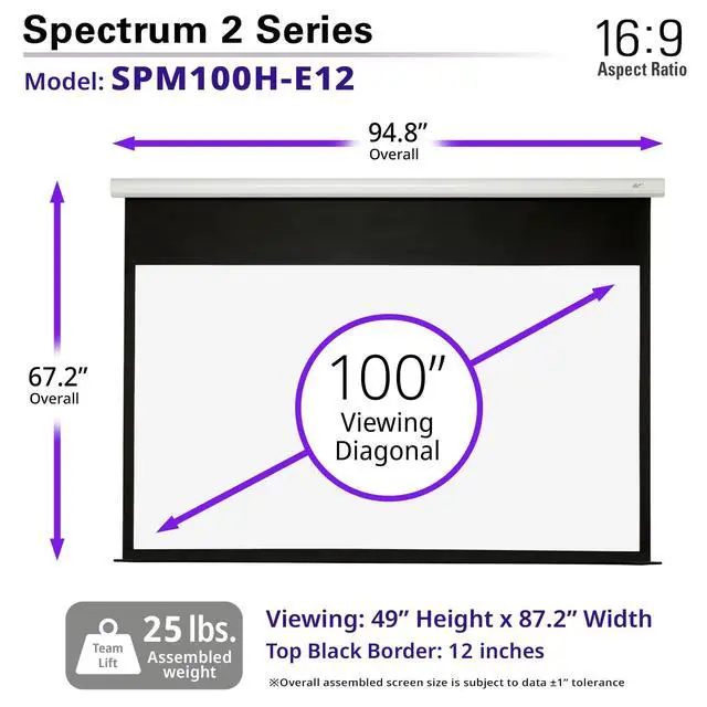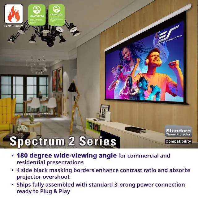 Elite Screens Spectrum 2 series is the absolute solutionfor anyone who is looking for a high quality electricprojection screen at a budget friendly price. Elite Screens Spectrum 2 series features include: Floating mount brackets allow easy alignment for a wall or ceiling installation 2-Year Manufactures Warranty and Lifetime Product Support byElite Screens; a ISO9001 manufacturer since 2004 Available in the following range of diagonal sizes: 91""/ 100""/ 110""/120"" and 138"" in 16:9 and 135""/150"" in 4:3 format*Optional Remote control kit, infrared (IR) remote, detachable 3-way wall switch, and 12V trigger cable (Part# ZPM-RT) - sold separately*Elite Screens Spectrum 2 series includes Elite Screens' MaxWhite FG FRONTprojection screen material which features: 180 Wide Viewing Angle 1 gain Active 3D, 4K Ultra HD, and HDR ready! Black masking borders enhance picture contrast Black Backed to Prevent Light Penetration/Loss*Not compatible with Ultra/Short-throw Projectors*Elite Screens is focused on providing the best quality products at affordableprices while offering exceptional service. Since 2004, Elite Screens has become aglobal leader in projection screen manufacturing through its headquarters in theUS and branch offices in Europe, Japan, Australia, India, Taiwan, and China. With afocus on superior product and service, Elite Screens is dedicated to making projectionscreens for any projection environment. Ask about Elites 2-year warranty and3-year ENR-G enhanced warranty.
