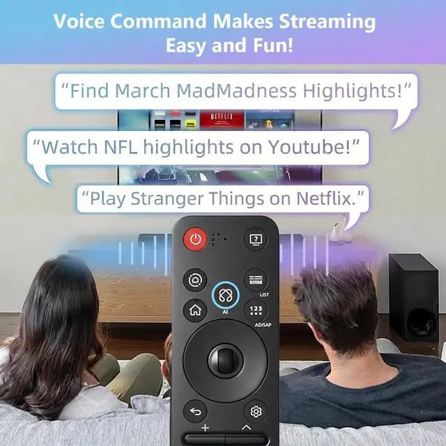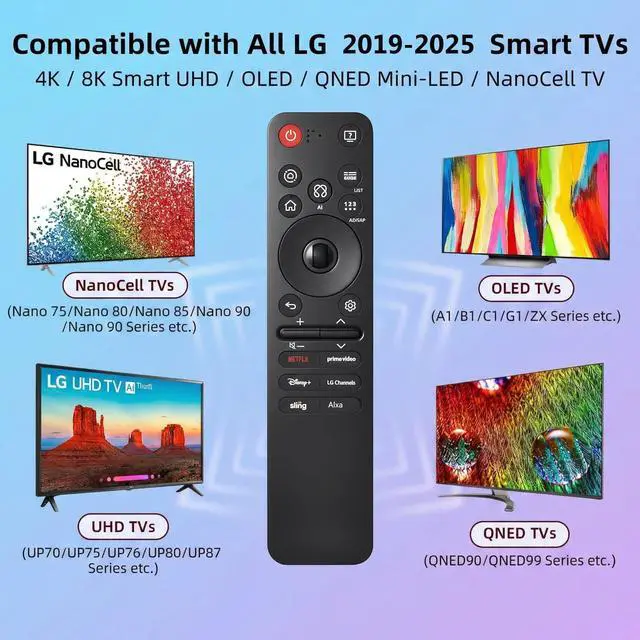 Broad CompatibilityThis high-quality remote is compatible with all 20192025 LG Smart TVs that support voice control. It's a perfect replacement for LG Magic Remotes, including (but not limited to) MR24GN/GA, MR23GN/GA, MR25GA/GN, MR22GA/GN, MR21GA/GC, MR20GA, MR19BA, AKB75855501 and many others. Important Notice For TV models that do not support voice control or were released before 2018, the voice search functionality may not work. This remote only works with LG TVs; Not for LG soundbars or TV boxes. ^^ Intelligent Voice ControlPlease pair your remote with the LG TV first to enjoy the advanced voice and pointer function.