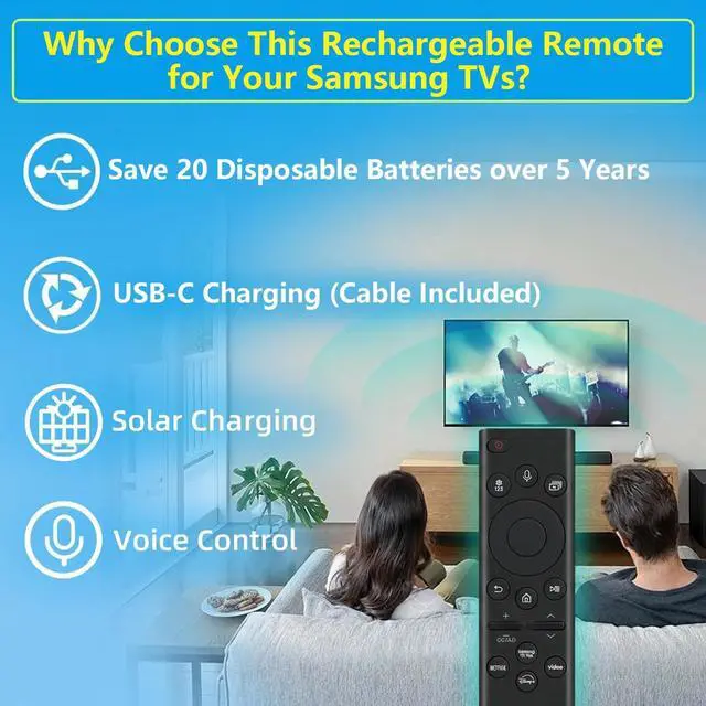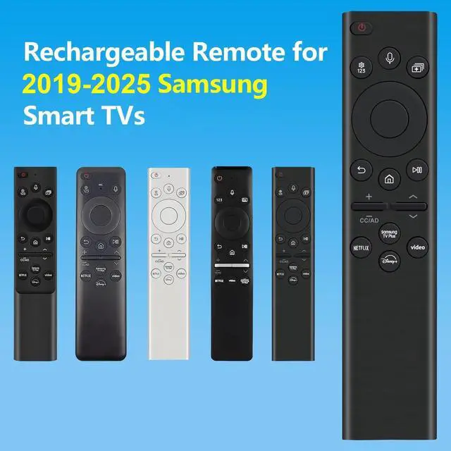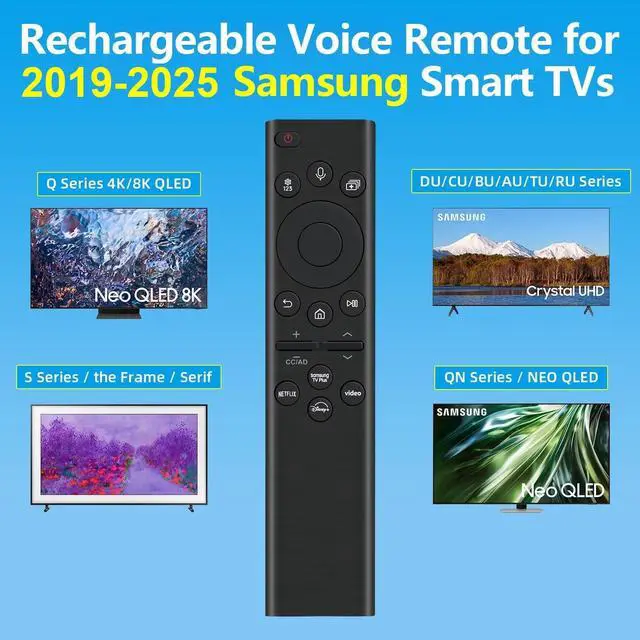 Broad CompatibilityThis rechargeable voice remote is designed for All 2019-2025 Samsung Smart TVs. It is a perfect replacement for Samsung TV Remotes with recharging feature. ^^ Recharging Saves Batteries With USB-C and Solar recharging, this remote eliminates 20 disposable batteries in 5 years. It supports convenient USB-C fast charging (cable included) and Solar Charging. ^^ Advanced Voice Control Built with a next-generation Bluetooth chip, this remote captures your voice commands instantly and accuratelyeven from across the room. Make sure to pair it as shown in the user manual before using voice control.