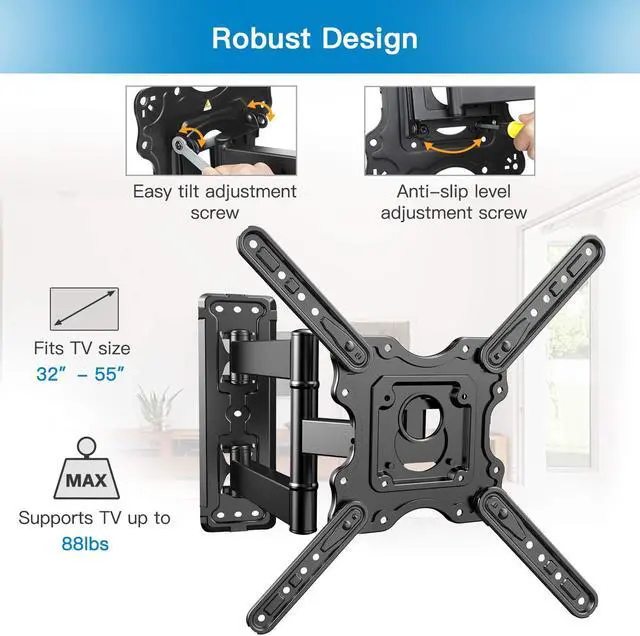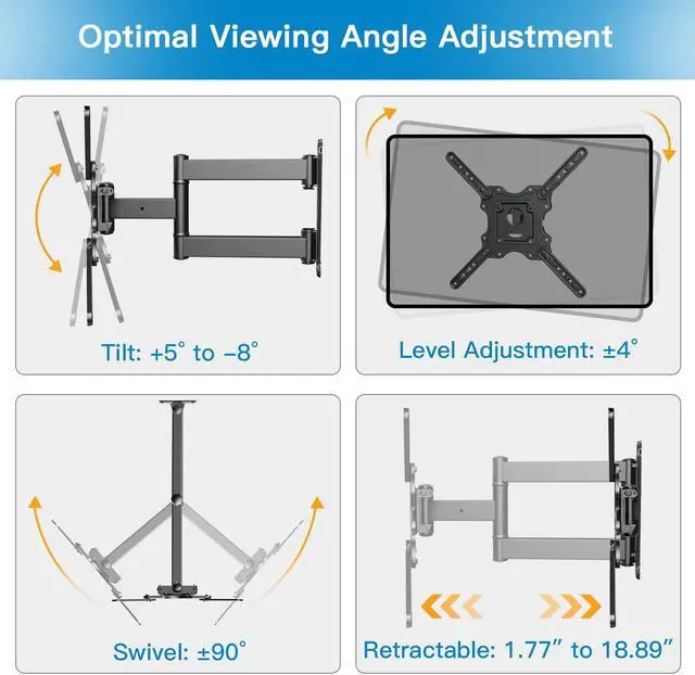 PSMFK12: CUSTOMIZE YOUR VIEWING EXPERIENCE: The articulating TV wall mount allows +5deg and -15deg tilt to reduce glare, 90deg swivel (maximum swivel angle depends on your TV) to position your TV exactly where you want it, and 1.77" to 18.89" arm extension for flexible movement and adjustment.