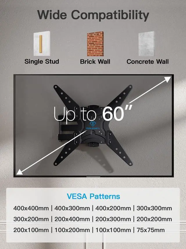 PSMFK1: Universal TV Mounting Bracket - Our TV wall mount fits well with brands Samsung, LG, TCL, Hisense, Vizio, Sony, Panasonic, Thomson, Toshiba, Sharp, Philips and other TV brands among 26-60 inch screen sizes, securely supports up to 70lbs LED or LCD flat panel TVs. With MAX VESA/ mounting holds spacing of 400x400mm(16x16), you can freely mount your TV on concrete or brick wall, even single wood stud.