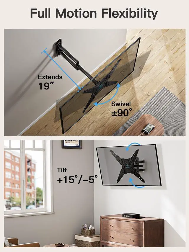 PSMFK1: Full Motion for Customized Viewing Angle - The articulating TV mount allows +/-90°swivel (max. swivel angle depends on TV size) to provid