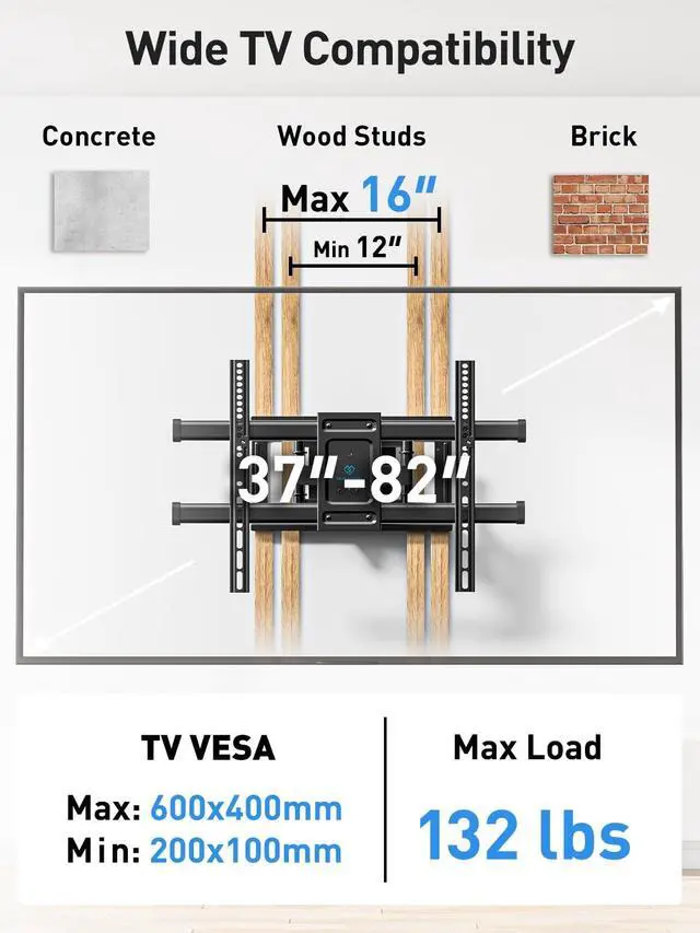 ^^ Sturdy and Safe: Our TV wall mount is constructed from high quality steel materials, features with dual articulating arms hold TV up to 132 lbs. TV wall mount is tested with up to 4x the rated weight limit to prevent your TV from accidental bumping ^^
