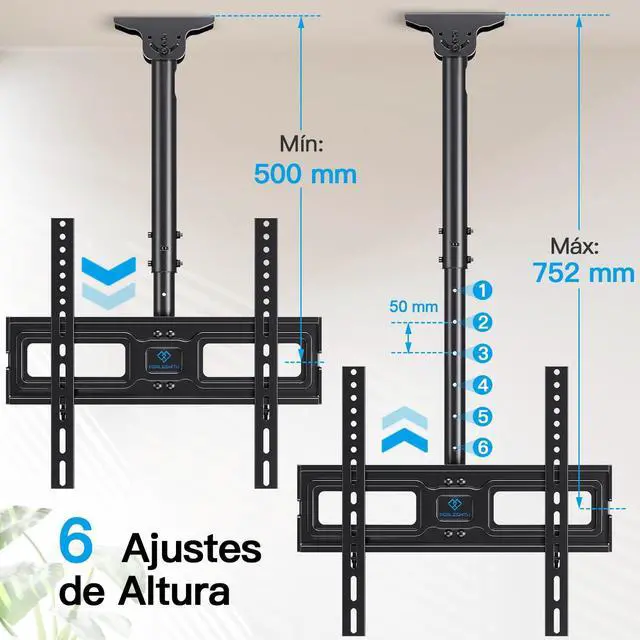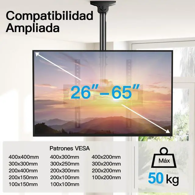 WIDE COMPATIBILITY- This TV ceiling mount fits most 26-65 inch flat screen TVs with VESA 100100 mm (4"4") to 400400 mm (16"16"), holding up to 110 lbs/50 kg, Please check the TV weight, VESA pattern before purchase. Compatible with wood stud, concrete, and brick wall mounting. Do not install the mount on drywall alone. ^^ HEIGHT ADJUSTMENT- This ceiling mount TV bracket comes with a very sturdy construction TV pole mount allowing the screen display to extend 20.47 to 29.92 from ceiling to center of TV plate for the perfect viewing angle, NOT flip down or fold down.
