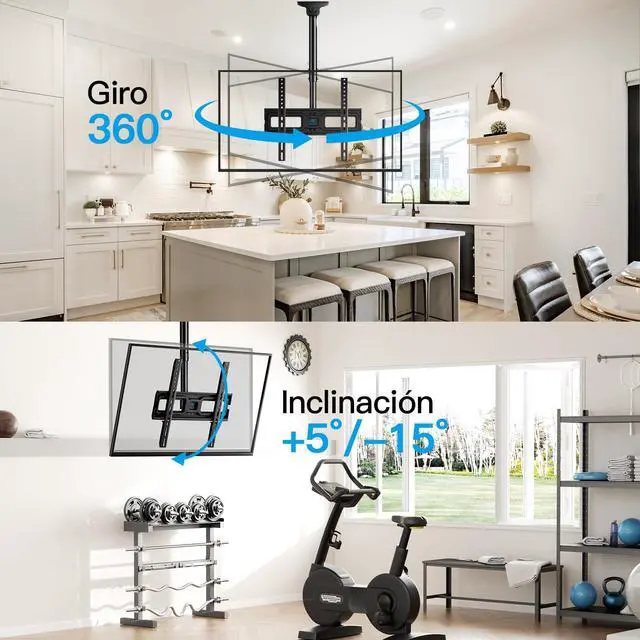 ^^ 360 OF SWIVEL- The full motion ceiling TV mount can tilt +10/-10 to reduce glare and swivels 360 to direct the screen toward your position for a more comfortable experience. Level the TV +/-3 after installation to perfectly tune the TVs position. The ceiling mount is out of the way of everything and a good option to set up various viewing angles. ^^ DURABLE & SAVING SPACE- Perfect for commercial use in restaurant, coffee shop, gym, grocery stores, airport, shopping mall and your home (gazebo church basement attic outdoor patio back porch fireplace) and more Neednt to drill through the fireplace rock or inserting it in the ceiling and securing it in the sloped ceiling attic is the best option.