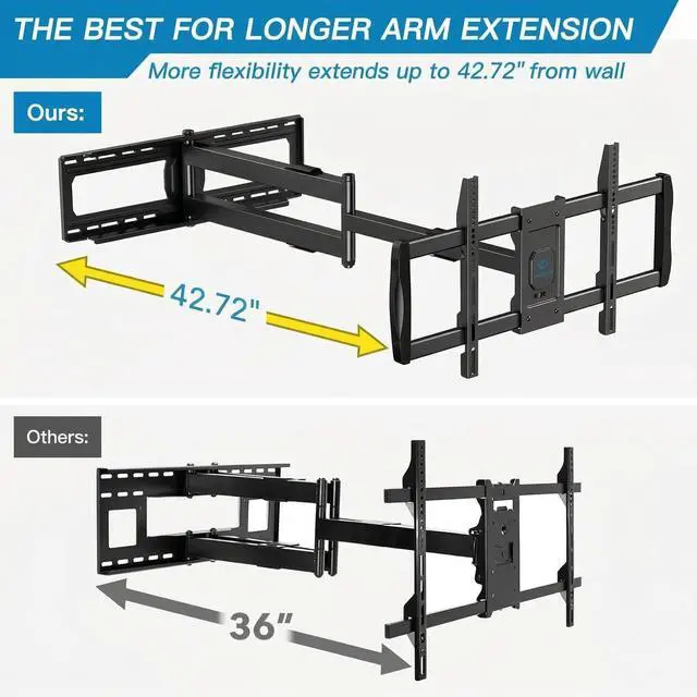 LONG EXTENSION TV MOUNT: This flexible long arm TV wall mount with 42.72 articulating extension arm allows you to view your TV from anywhere in your room. Features 90-degree swivel left and right, allowing you to direct the screen toward your viewing position. Excellent choice for mounting in a corner or in a recessed space.