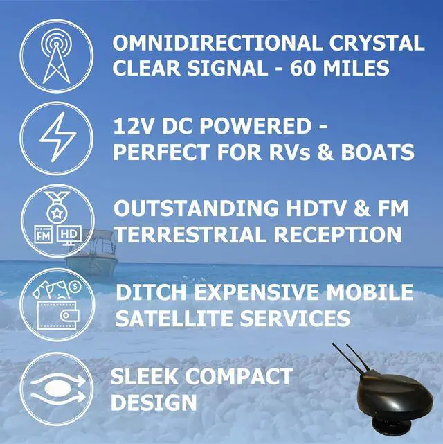 Omnidirectional Mobile Outdoor HDTV Antenna - Amazing performance for a compact mobile vehicle TV antenna. The Free Signal TV Stealth Antenna is omnidirectional, receiving outstanding HDTV and FM terrestrial reception from all directions, capable of capturing transmission sources up to 60 miles away. ^^ High-Performance Mobile and Marine HDTV Antenna - Years of research have gone into engineering our cutting-edge 12 volt DC powered Stealth TV antenna. Superior picture and sound quality for a wide variety of mobile applications. A great alternative to Marine Satellite TV service. Free terrestrial TV signals with 60 mile + reception capability.