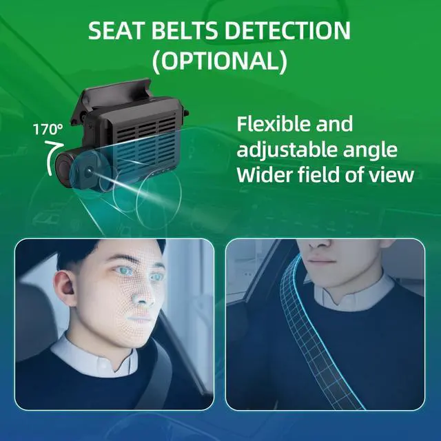 AI Dash Camera with real-time alertsThis intelligent dashcam uses a variety of AI algorithms, such as ADAS, DMS, Face Recognition and Seatbelt Detection to provide tools that help improve road safety, driver safety and compliance.