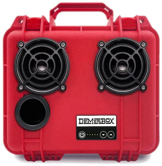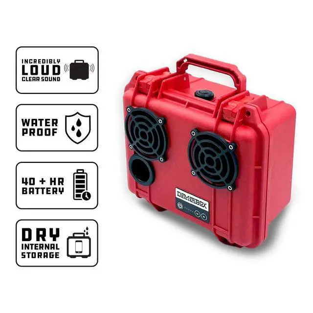 WATERPROOF AND PORTABLE: Includes a Port Plug that installs quickly to become fully waterproof. Every DemerBox is a waterproof case that opens to keep valuable items like your wallet, keys and phone safe and dry inside. Never worry about rain at your backyard party or the speaker falling overboard again! Plus, the compact size and light weight makes it easy to take anywhere. ^^ MADE FROM A GENUINE PELICAN CASE: Built in a crush-proof Pelican case, DemerBox lasts an incredible 40 hours between charges. Plus, it has internal USB charging to keep your devices juiced up for your entire adventure! Its rugged and durable construction is designed to brave any outdoor environment water, rain, hail, dirt, sand, heat, snow! ^^