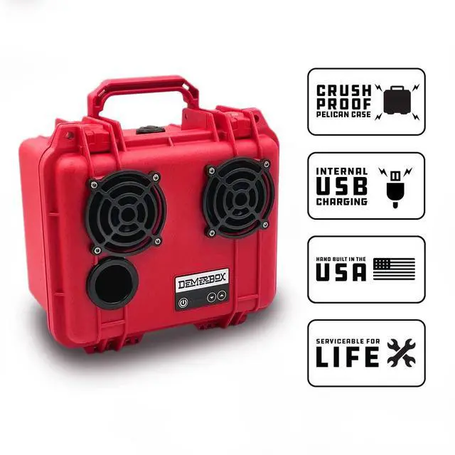 • MADE FROM A GENUINE PELICAN CASE: Built in a crush-proof Pelican case, DemerBox lasts an incredible 40 hours between charges. Plus, it has internal USB charging to keep your devices juiced up for your entire adventure! Its rugged and durable construction is designed to brave any outdoor environment water