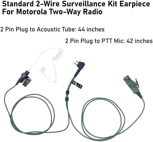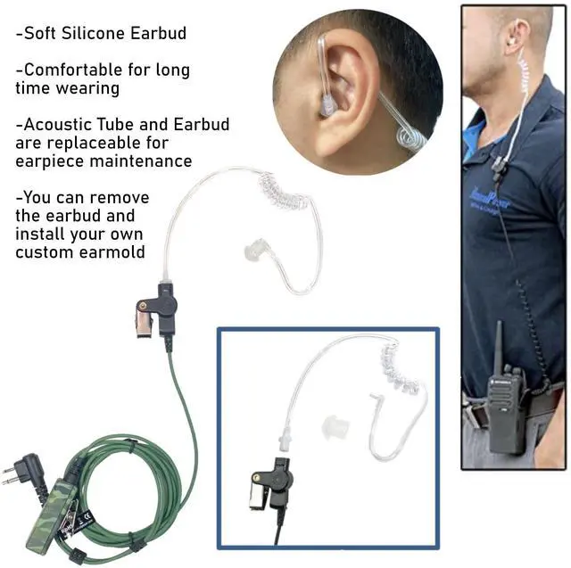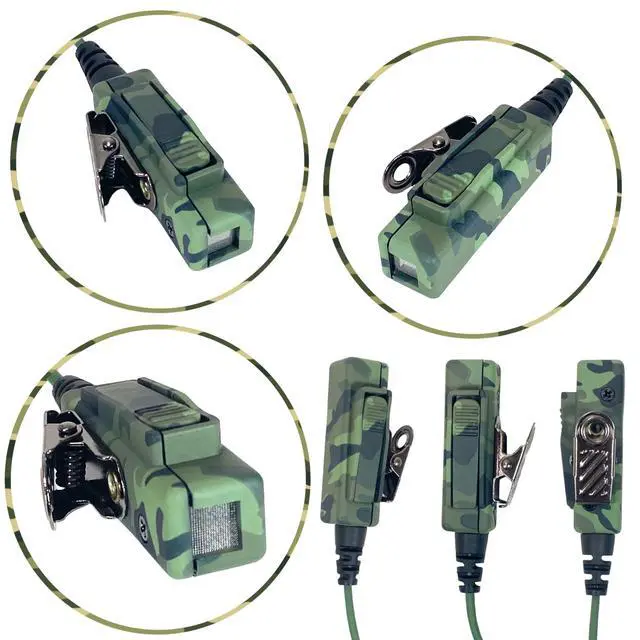 Maximal Power 2 way radio surveillance headset earpiece in camouflage color with mic, clear coil tube, earbud, metal clip and 2-pin connector works for MOTOROLA 2-way radios with 2-pin connector. This earpiece is designed with Push-To-Talk (PTT) mic and single surveillance style acoustic tube. It is made with TWO polyurethane jacketed, KEVLAR reinforced wires and heavy duty, rugged poly-carbonate housed PTT mic. The metal clip secures the PTT Mic to the user's lapel or collar, conveniently locating it for easy use. The low profile clear ear tube provides outstanding incoming communications.