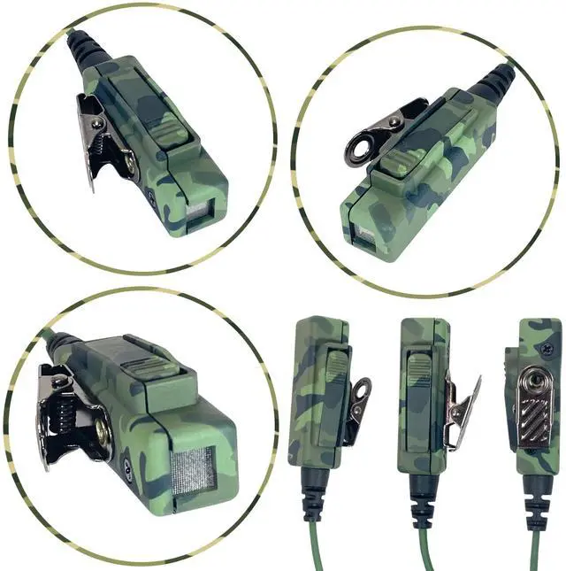 Maximal Power 2 way radio KEVLAR reinforced 2-wire surveillance headset earpiece in camouflage color with mic, clear coil tube, earbud, metal clip and 2-pin connector works for MOTOROLA 2-way radios with 2-pin connector. This earpiece is designed with Push-To-Talk (PTT) mic and single surveillance style acoustic tube. It is made with TWO polyurethane jacketed, KEVLAR reinforced wires and heavy duty, rugged polycarbonate housed PTT mic. The metal clip secures the PTT Mic to the user's lapel or collar, conveniently locating it for easy use. The low profile clear ear tube provides outstanding incoming communications.