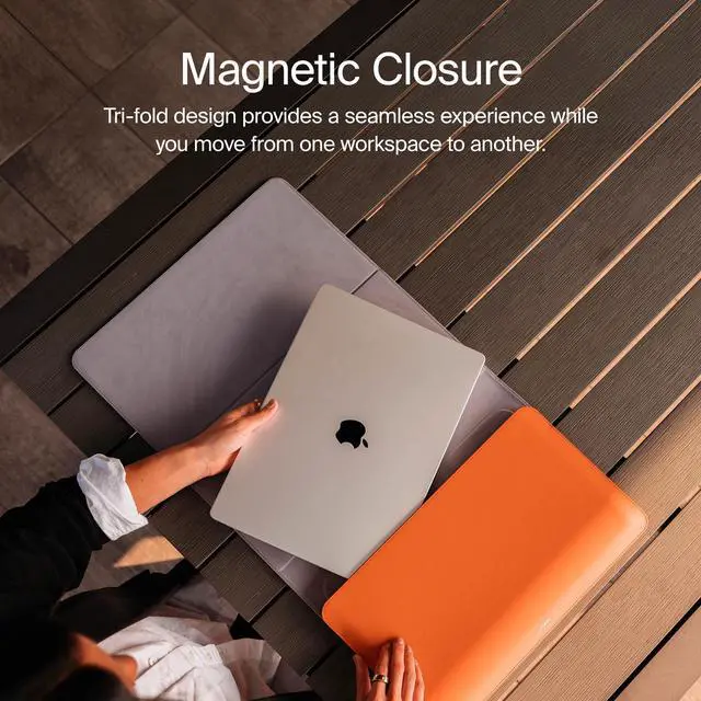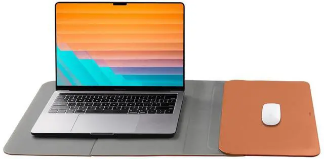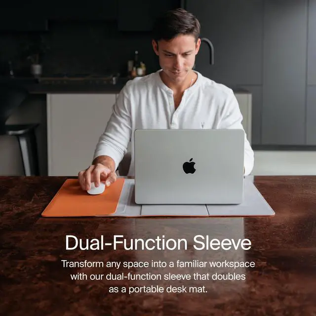 Portable desk mat and laptop sleeve in one ^^ Quick setup with magnetic closure ^^ Slim and stylish design, fits in any bag ^^ Laptop pocket doubles as a built-in mouse pad ^^ Perfect on-the-go workspace ^^ Premium vegan leather & recycled woven fabric