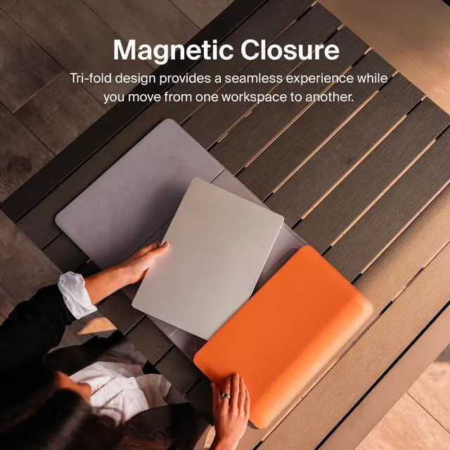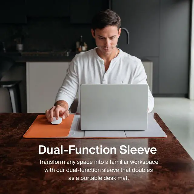 Portable desk mat and laptop sleeve in one ^^ Quick setup with magnetic closure ^^ Slim and stylish design, fits in any bag ^^ Laptop pocket doubles as a built-in mouse pad ^^ Perfect on-the-go workspace ^^ Premium vegan leather & recycled woven fabric