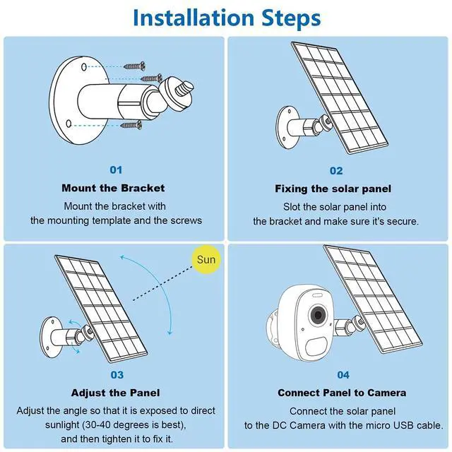 Adjustable Mounting Bracket: 360-degree swivel and 90-degree tilt adjustable mounting bracket that allows you to position the 3.2 watt solar panel at the optimal angle for maximum sunlight exposure. This will help ensure that your camera's battery is consistently charged.