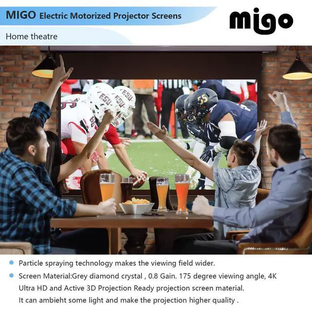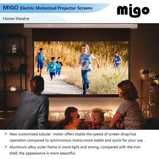 The movie electric projector screen with remote enhances contrast for an immersive home theater experience ^^ [Projector Compatibility] Motorized Projector Screen supports short throw (Good), ultra-short throw (Average), and long throw (Recommend). Electric projector screen supports indoor home theater with vibrant colors and immersive cinema experience ^^ [All Scene Installation] MIGO motorized projector screen specially designed for most U. S. homes, ensures easy setup in various environments. The 150 inch projector screen supports 5 installation methods, including wooden or concrete ceiling and wall mounts ^^ [Lifetime Support & FCC Certification] MIGO electric projector screen offers lifetime email support.