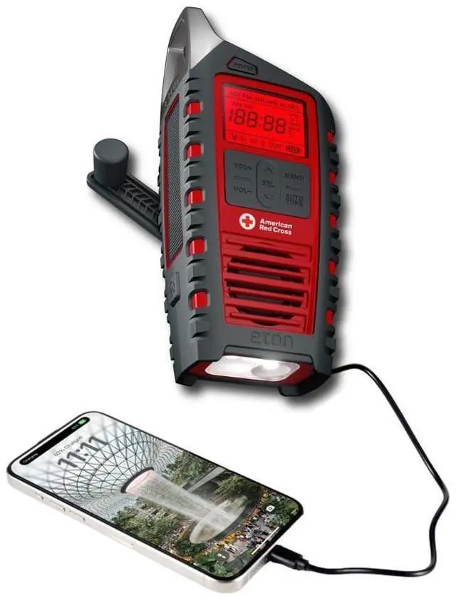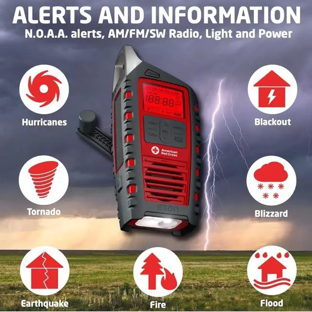 NOAA Weather Alert Radio This compact radio features comprehensive AM, FM, Shortwave, and NOAA weather bands with RDS. Stay connected to National Weather Service alerts with this storm radio, receiving both visual and audio warnings for tornadoes, floods, hurricanes, and more. Essential for preparedness or outdoor adventures. ^^ Multiple Power Sources The radio includes multiple sustainable power options: a solar panel to charge the internal battery via sunlight, and a hand crank for recharging during power outages or when off-grid. Its equipped with a rechargeable 2000mAh battery, ideal for staying powered during emergencies, storms or everyday use. ^^ Flashlight Built with a super bright 3-multiple LED flashlight featuring high/low/flood settings and an emergency SOS alarm. Perfect for lighting your campsite or signaling for help in emergencies, ensuring youre prepared for any situation. ^^ Digital AM/FM and Shortwave Radio with Clock Equipped with a digital tuner, the radio offers clear AM/FM and Shortwave reception for entertainment and live updates direct from the source. The large backlit LCD display ensures easy visibility. Compact and portable, its perfect for outdoor adventures or your doomsday kit. ^^ Phone Charger and Bluetooth Charge your devices on the go with the USB output, ensuring your smartphone and other essentials stay powered, even in remote locations. Connect via Bluetooth to stream music or content directly from your phone.