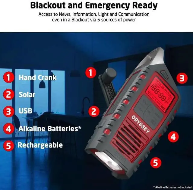 NOAA Weather Alert Radio This compact radio features comprehensive AM, FM, Shortwave, and NOAA weather bands with RDS. Stay connected to National Weather Service alerts with this storm radio, receiving both visual and audio warnings for tornadoes, floods, hurricanes, and more. Essential for preparedness or outdoor adventures. ^^ Multiple Power Sources The radio includes multiple sustainable power options: a solar panel to charge the internal battery via sunlight, and a hand crank for recharging during power outages or when off-grid. Its equipped with a rechargeable 2000mAh battery, ideal for staying powered during emergencies, storms or everyday use. ^^ Flashlight Built with a super bright 3-multiple LED flashlight featuring high/low/flood settings and an emergency SOS alarm. Perfect for lighting your campsite or signaling for help in emergencies, ensuring youre prepared for any situation. ^^ Digital AM/FM and Shortwave Radio with Clock Equipped with a digital tuner, the radio offers clear AM/FM and Shortwave reception for entertainment and live updates direct from the source. The large backlit LCD display ensures easy visibility. Compact and portable, its perfect for outdoor adventures or your doomsday kit. ^^ Phone Charger and Bluetooth Charge your devices on the go with the USB output, ensuring your smartphone and other essentials stay powered, even in remote locations. Connect via Bluetooth to stream music or content directly from your phone.