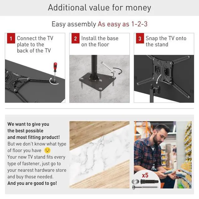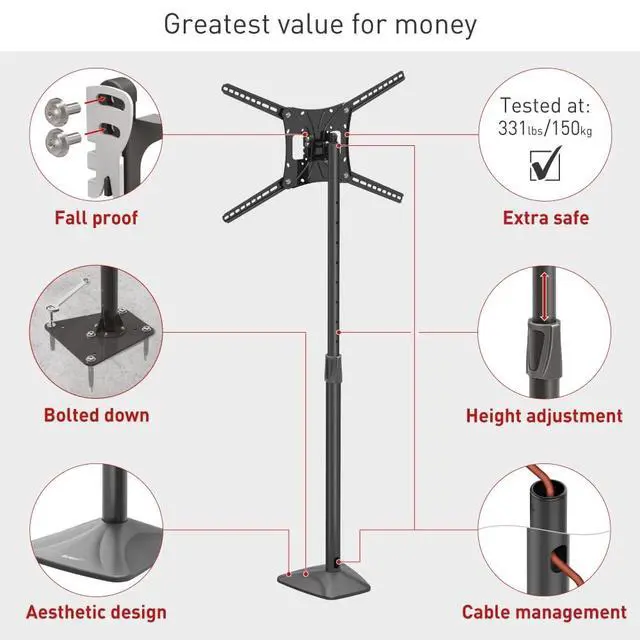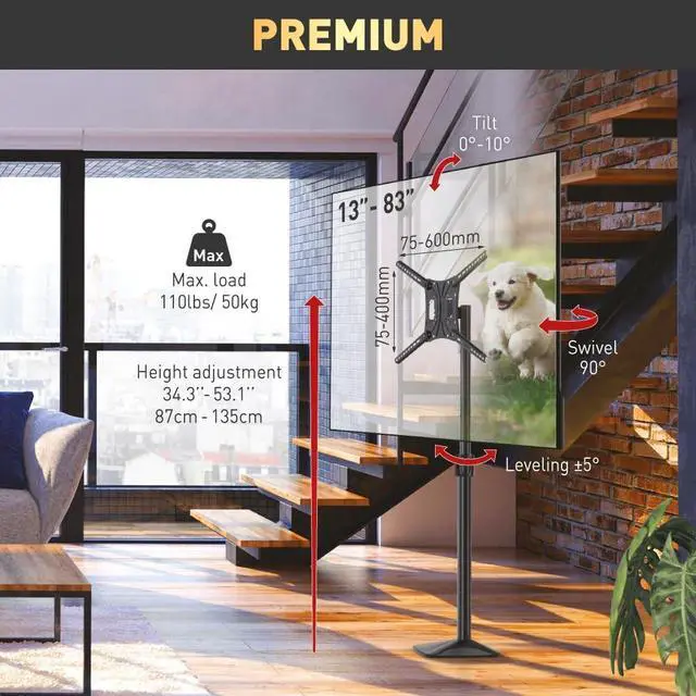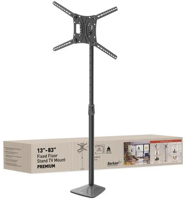 5 YEAR WARRANTY - This TV Stand was tested with 3 times its declared weight. 100% of Barkan products pass strict quality tests. ^^ FEATURES - The TV mount fits most 13-83" TVs up to 110lbs. Fits TVs with mounting holes patterns: 75x75, 100x100, 100x200, 200x100, 200x200, 200x300, 300x200, 300x300, 300x400, 400x200, 400x300, 400x400, 600x400 mm and non-VESA up to 600x400 mm. ^^ FUNCTIONALITY - To provide a better point of view, the stand allows adjusting the height of the creen between 35-54" from the screen center to the floor, as well as a tool-free tilt from -5 till 10. ^^ TOUCH & MOVE - Easily tilt the TV and move the stand by gently pushing or pulling it to the desired angle. Enjoy the perfect point of view without any trouble. ^^ TOUCH & MOVE - Easily rotate, swivel or tilt the TV by gently pushing or pulling it to the desired angle. Enjoy the perfect point of view without any trouble. ^^ WORLD KNOWN BRAND - Since its foundation in 1988, Barkan Mounts has been working to enhance the viewing experience of the customer. Our expertise is in the development, manufacturing and marketing of designed and innovative TV Mounts.