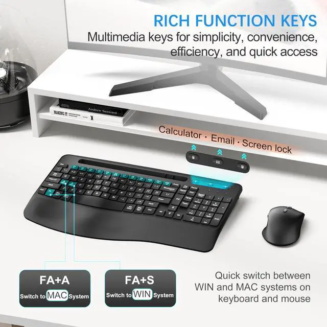 Ergonomic Wave Keyboard and Mouse: Featuring wave-shaped keycaps and an ergonomic wrist rest, complemented by a 7deg adjustable stand, this compact keyboard perfectly fits the natural curvature of your hands, effectively reducing wrist and palm strain during prolonged typing sessions. The full-size keyboard includes a built-in phone holder, allowing you to maintain the optimal viewing angle for both work and play. The mouse, with its streamlined design, fits comfortably in your hand, providing an unparalleled level of comfort and stability.