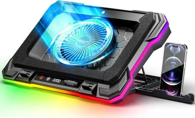 Laptop Cooling Pad Powerful Turbo Fan RGB Gaming Notebook Cooler, Moojay Laptop Fan Cooling Stand with 8 Adjustable Heights and Phone Holder, for 14-19 Inch Laptops - Ice Blue LED Light