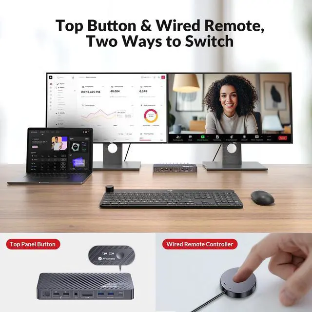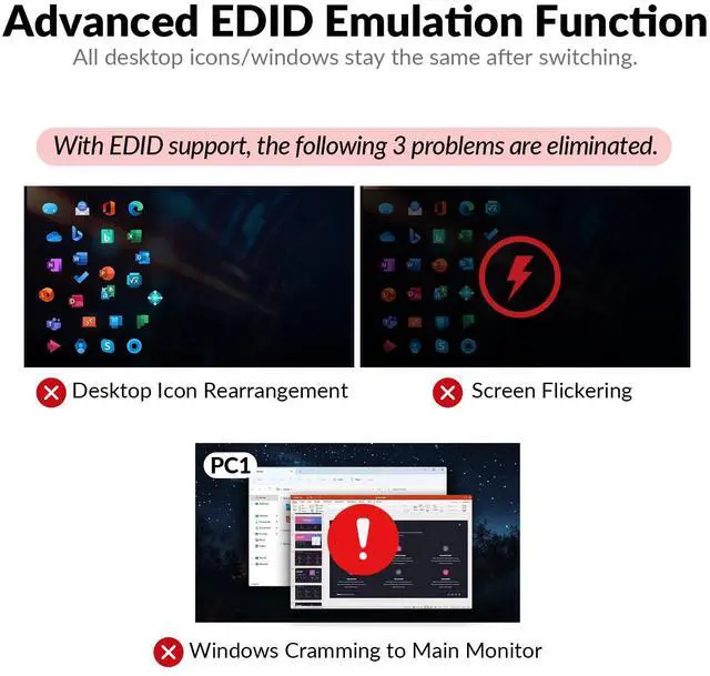 Smooth Dual Monitor Output with High Refresh Rate Supports up to 4K@60Hz, 1440p@144Hz, and 1080p@240Hz for ultra-smooth video and gaming. Whether you're working or gaming, this KVM switch for laptop and desktop ensures crystal-clear visuals and a responsive experience.