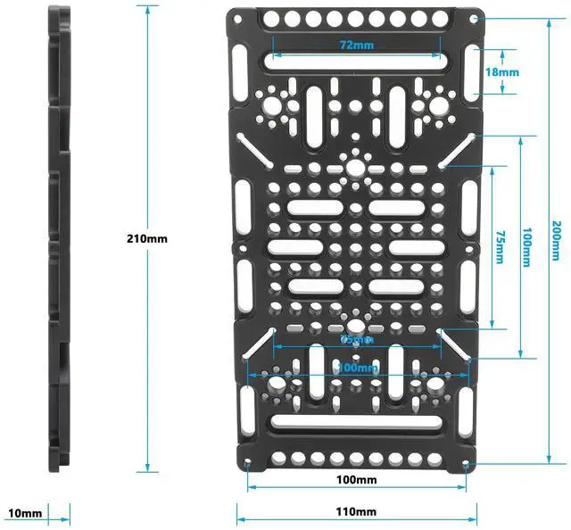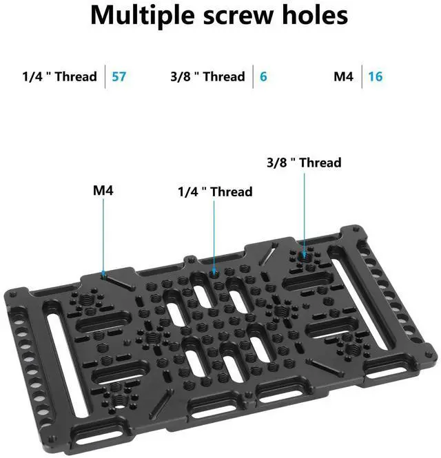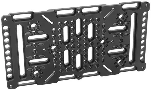 Mount your 75 x 75mm, 100 x 100mm or 200 x 100mm VESA-compatible monitor/flat panel display/screen and expand its mounting capabilities with this Multipurpose Cheese Plate. M4 screws plus 75 x 75mm, 100 x 100mm and 200 x 100mm VESA mount configuration attach the cheese plate to the compatible monitor of your choice. Various 1/4"-20 threads and 3/8"-16 threads with ARRI-style anti-twist divots/slots allow you to attach the moitor to an arm or other support of your choice. Incorporating M4 threads into the main surface, it lets you mount the plate to a wall mounted TV arm or a stand with VESA adapter plate.