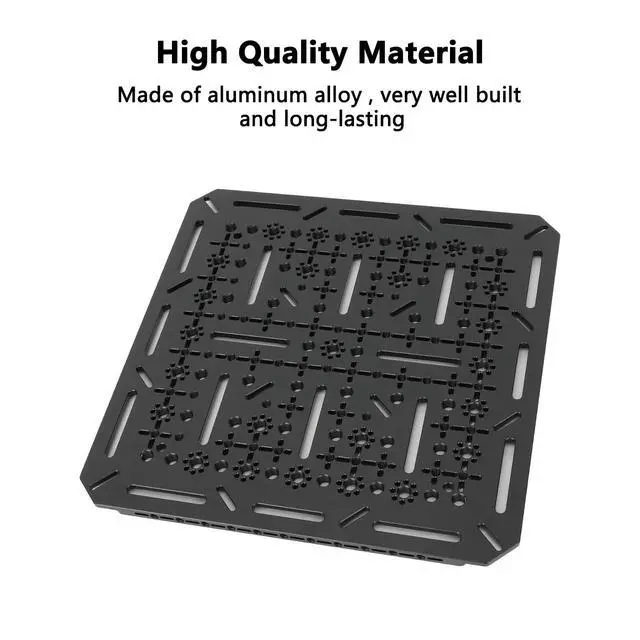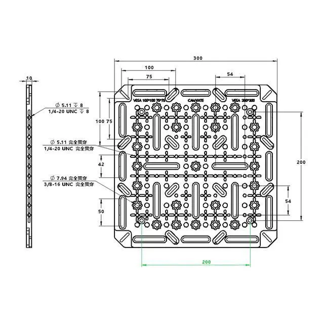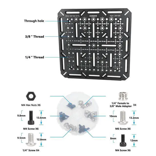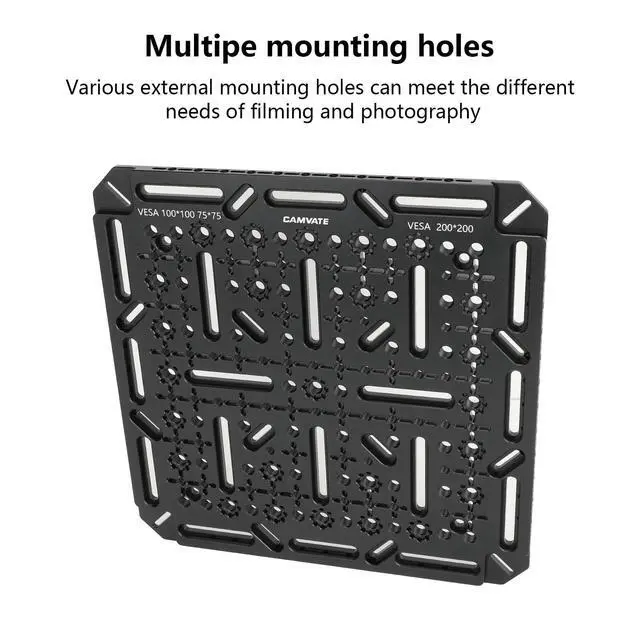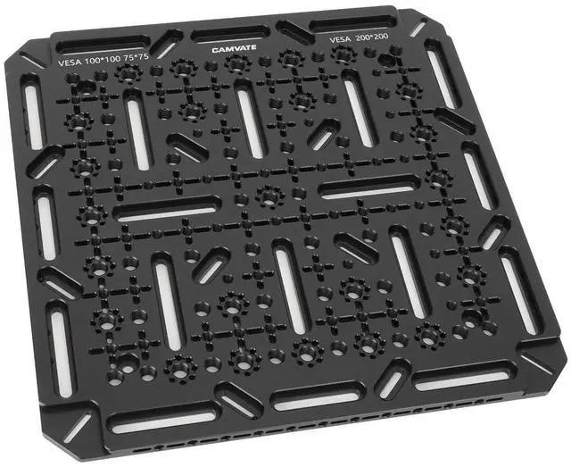 Dimensions: 300 x 300 x 10mm ^^ Fits Most 32 to 55" TVs & Monitors ^^ VESA 75 x 75, 100 x 100, 200 x 200mm Hole Patterns ^^ 1/4" Countersunk Slots for Flexible Mounting Options ^^ 1/4"-20/Anti-Twist Threads along the Main Surface and Edges ^^ 3/8"-16/ARRI-Style Anti-Twist Threads along the Main Surface