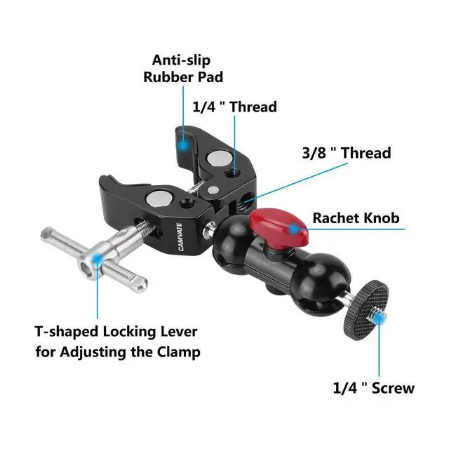 The CAMVATE product is made of high quality aluminum alloy and stainless steel. The clamp provides several 1/4"-20 and 3/8"-16 threaded mounting holes, and it secures to any rod / pole / table edge sized 0.4" to 2" via a silver T-handle locking lever. The clamp features rubber pads to ensure a secure fit without scratching your equipment. It affixes your camera or accessory to the 1/4"-20 screw on the ball head mount which rotates 360 for fine adjustment.