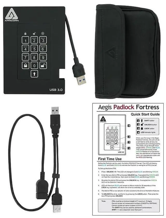 Aegis Padlock Fortress combines the highest level of data security, FIPS 140-2 Level 2 and the fastest USB 3.0 interface for uncompromising security and performance. With an easy-to-use keypad and no software installation for setup or operation and the ability to run on any platform, The Aegis Padlock Fortress is ideal for any environment. The Fortress can be configured with independent Admin and User PIN's. This allows the user to access the drive with their own unique pin and the administrator the ability to access the drive if the user leaves or to set a new pin number should the user forget theirs.