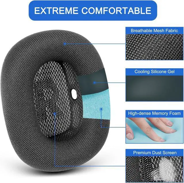 [Longer Lasting Mesh] The airpod max replacement earpad cushions is made of premium mesh fabric, just like original earpads, which is more breathable and longer lasting than the general leather material. We have also adopted the silicone gel under the mesh layer, make our ears more comfortable for one day's listening.