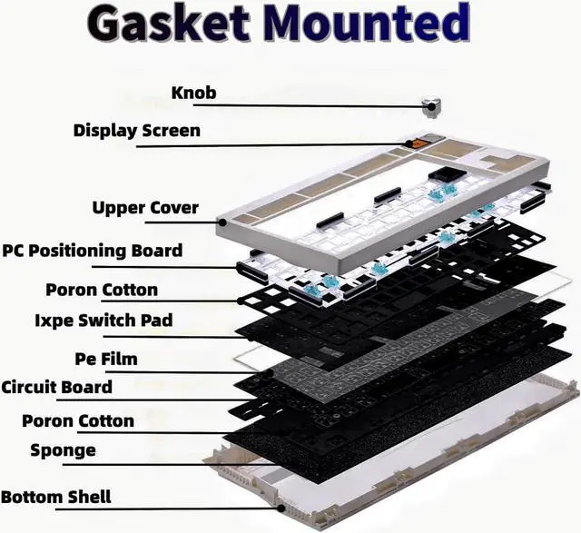 Compact 80% Layout Gasket Mounted Keyboard KitWith Gasket Mounted design, four-layer padding design of PE film, double Poron cotton and ixpe switch pad, not only can effectively reduce the noise, but also for you more soft and elastic feel experience