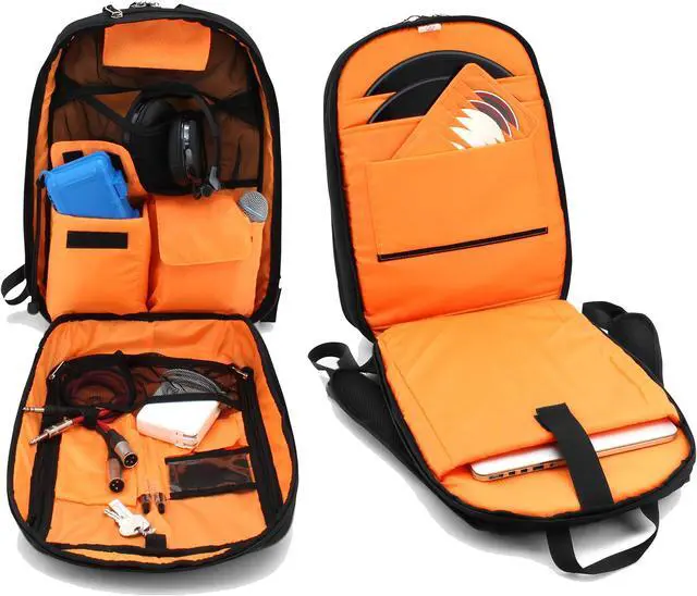 Padded main compartment with elevated headphones section and interior sleeves for laptop, vinyl records, cables, and more