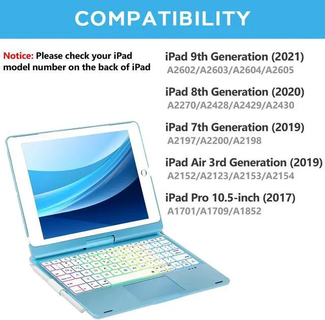 CompatibilityiPad 9th Generation case with keyboard is perfectly compatible with iPad 9th Generation 2021, 10.2" (A2602, A2603, A2604, A2605), iPad 8th Generation 2020, 10.2" (A2270, A2428, A2429, A2430), iPad 7th Generation 2019, 10.2" (A2200, A2197, A2198), iPad Air 3rd Generation 2019, 10.5" (A2123, A2152, A2153, A2154) & iPad Pro 10.5 inch 2017 (A1701, A1709, A1852).