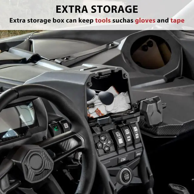 Provide extra storage while take up no space, directly installed above the dash, a small storage box with an GPS tablet phone holder; Add storage space and it is easier to reach the dash 12V outlet for device charging