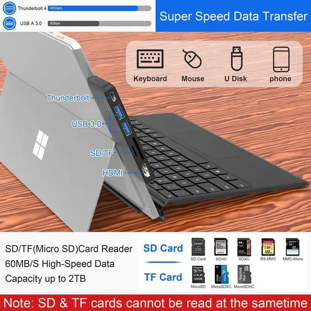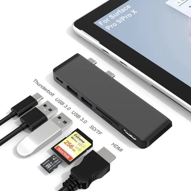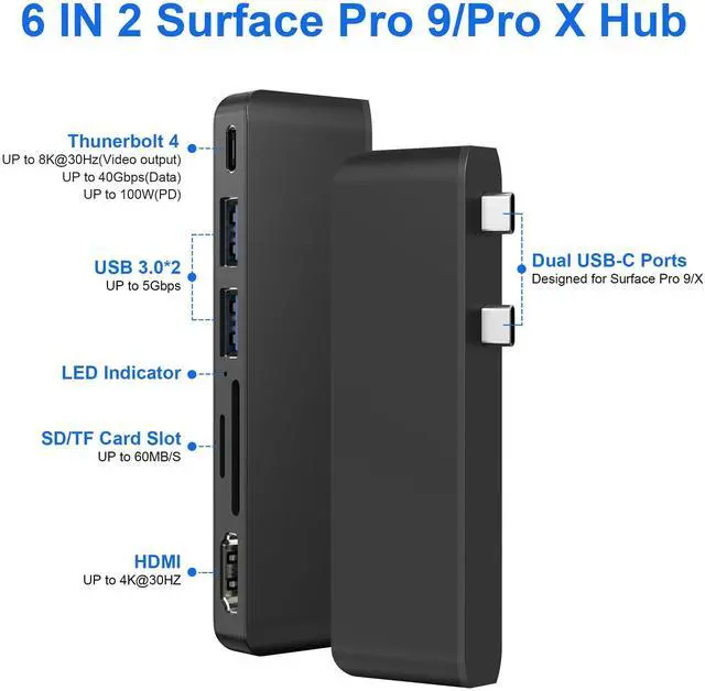Specifically Designed for Microsoft Surface Pro 9: Specifically developed for Microsoft Surface Pro 9, which turns the 2 USB-C connection into 6 ports: 1x 4K@30Hz HDMI port, 2x USB 3.0 ports, 1x USB C port (8K@30Hz Video Display + 40Gbps Data Transfer + 100W Charging), 1x SD card slot, 1x TF (Micro SD) card slot.