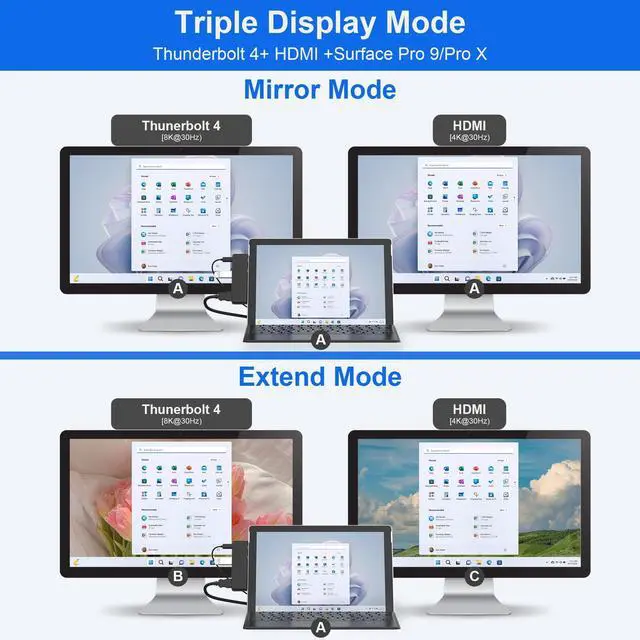 Triple video display Surface pro 9/ Pro X accessories: Triple video display ( Ultra HD 4K@30Hz HDMI + 8K@30Hz USB-C Thunerbolt 4 ) + Surface Pro 9/ Pro X modes Boost your efficiency 3 times. This Surface Pro 9/ Pro X accessories allows you to extend 2 monitors which provide more space for work and you can do different project