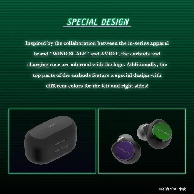 Special Design Inspired by the collaboration between the in-series apparel brand "WIND SCALE" and AVIOT, the earbuds and charging case are adorned with the logo. Additionally, the top parts of the earbuds feature a special design with different colors for the left and right sides!