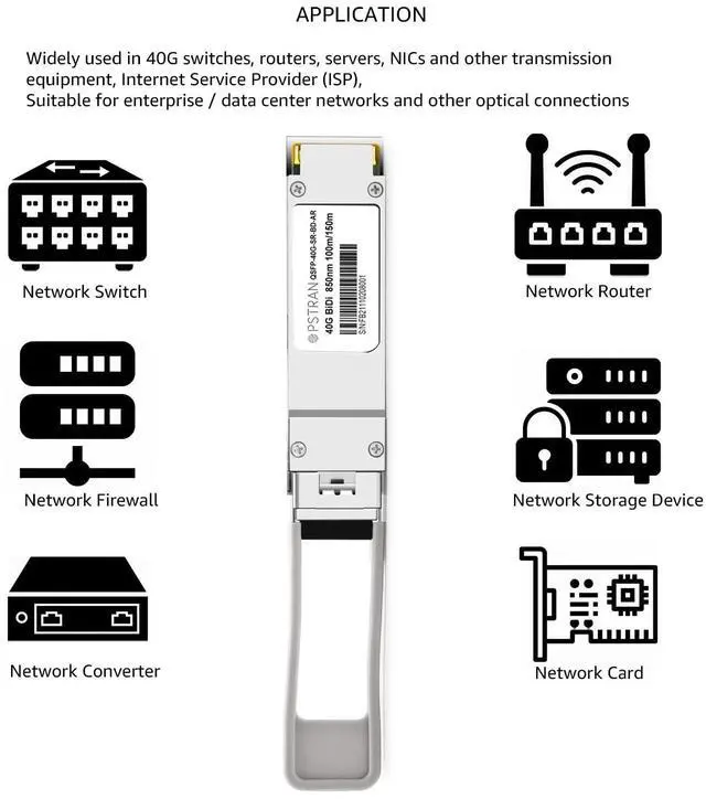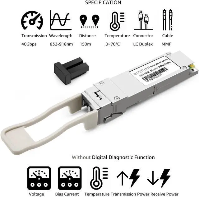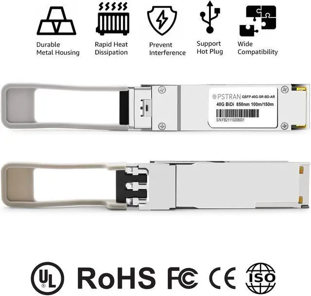 40GBASE-SR BiDi QSFP+ Optical Transceiver Module, Built-in high performance Chip, Max. Power Consumption 3.5W enable Prolonged Service Life, Commercial Temperature Range 0 to 70°C (32 to 158°F)