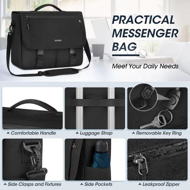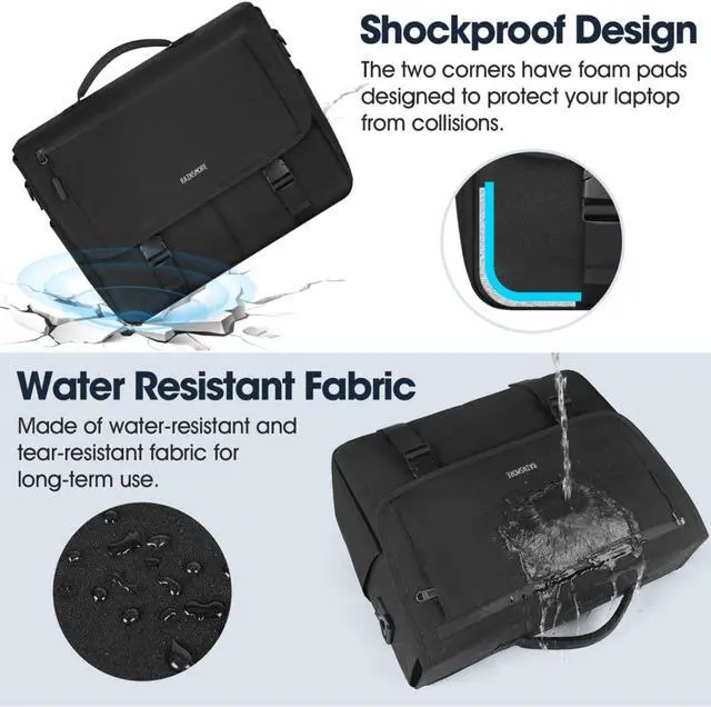 Durable Messenger Bag This messenger bag is made of durable, scratch-resistant and water resistant polyester fabric. Messenger bag for men equipped with smooth zipper and sturdy handle, plus the reinforced stitching at each stress point, make this laptop bag more durable for long-term use. Also, the briefcase has a front pocket which adopts leakproof zipper design can protect your belongings in rainy days.
