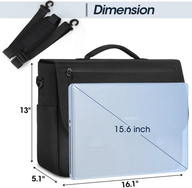 Roomy Organizer Briefcase The laptop briefcase is roomy to keep your items organized. There has 5 pockets on the outside of the bag. Under the cover, there also has 1 main padded pocket with a thick foam pad fits up to 15.6'' laptop. Also, it has multiple compartments to store books, document, folders and mouse. And has various separate pockets to store pen, business card or other small items. What's more, it has a detachable keychain can help you find your keys easily.