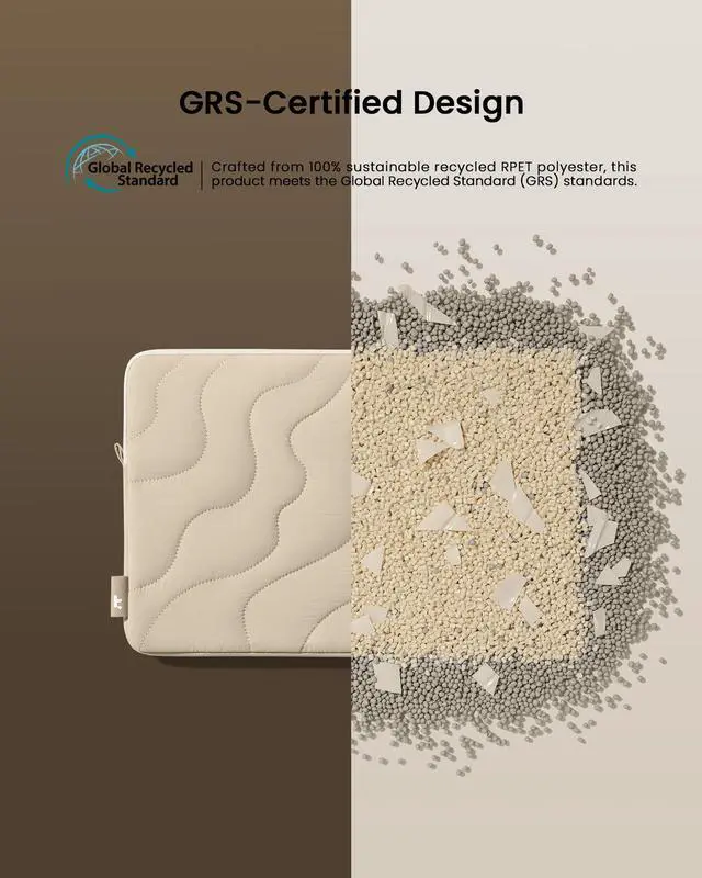 Terra Elegance: Crafted from recycled materials, this puffer laptop sleeve combines elegance with sustainability. Its distinctive contour line design creates timeless aesthetics, perfectly tailored to embrace your cherished MacBook